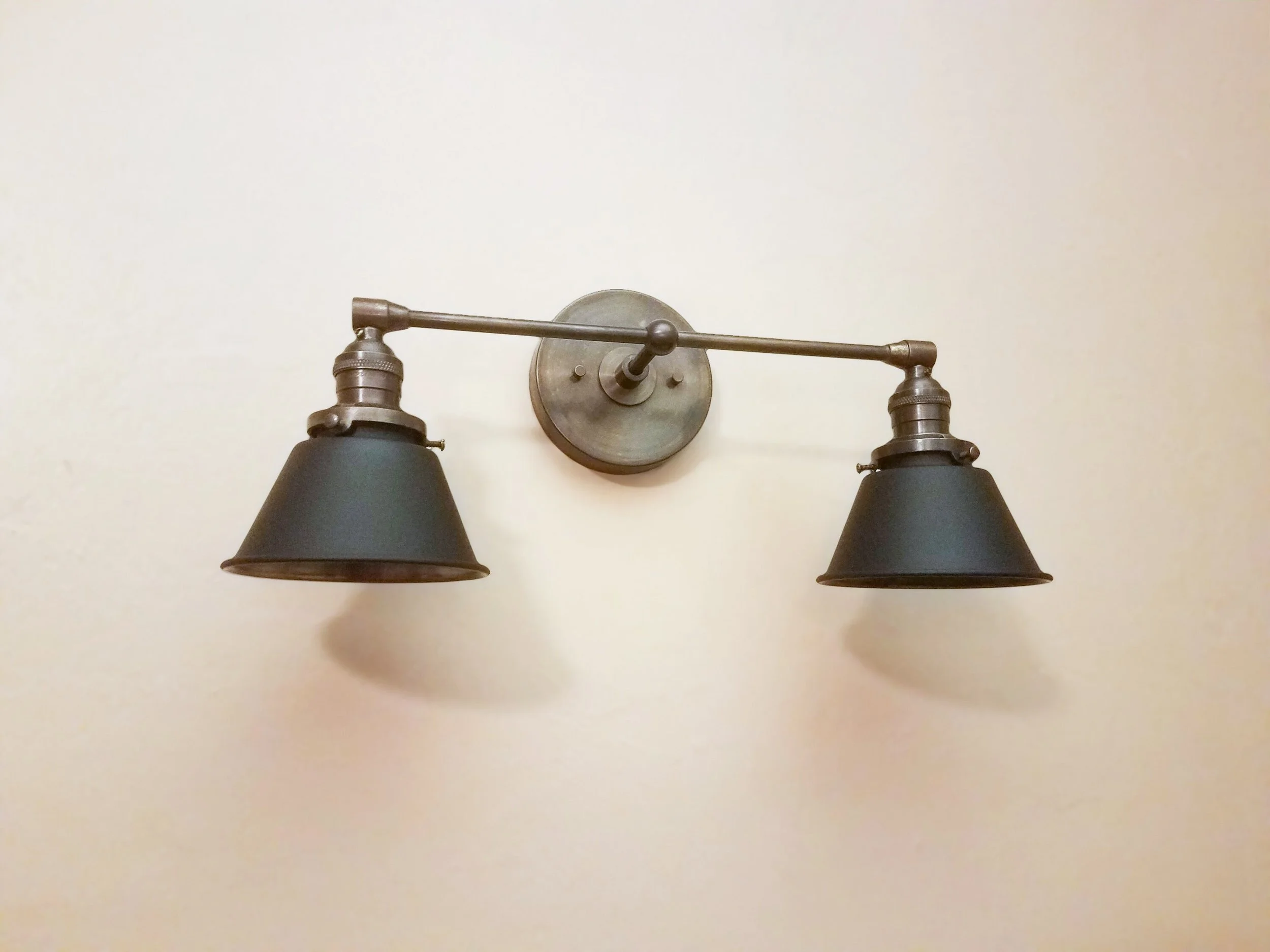 The pictured sconce is done in an antique brass finish and matte black shades.