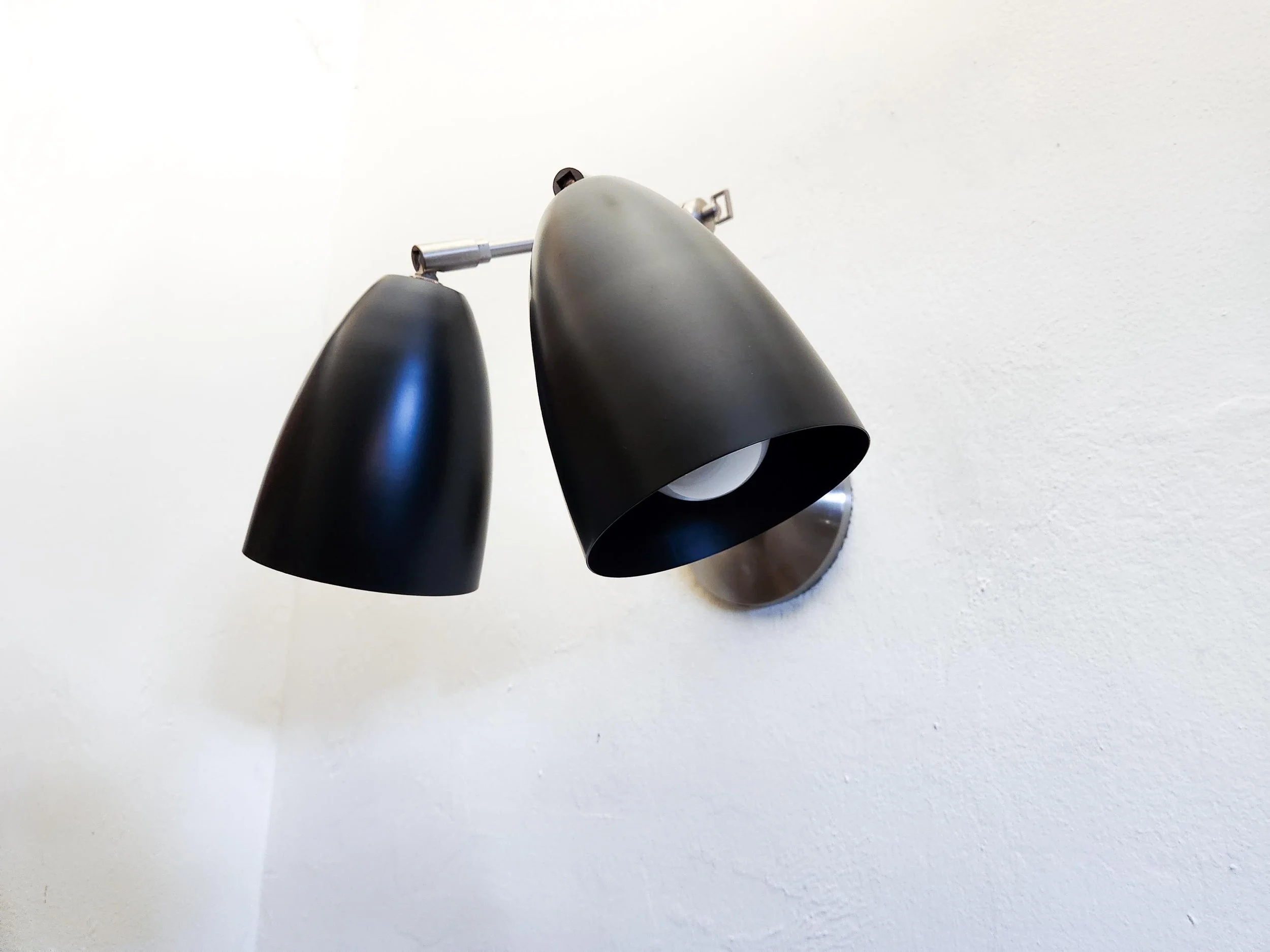 This wall light is perfect whether used by the bed, over the sink, or above bookcases or shelves, this highest-quality double bullet shade wall lamp will direct the light just where you want it with, double-jointed arms, pivoting shades and a variable extension.