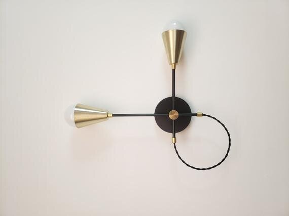 Minimalist Black and Gold Wall Sconce - 2 Bulb Light Fixture - Modern Contemporary - Brass Cones - Mid Century - Industrial - Bathroom Lamp