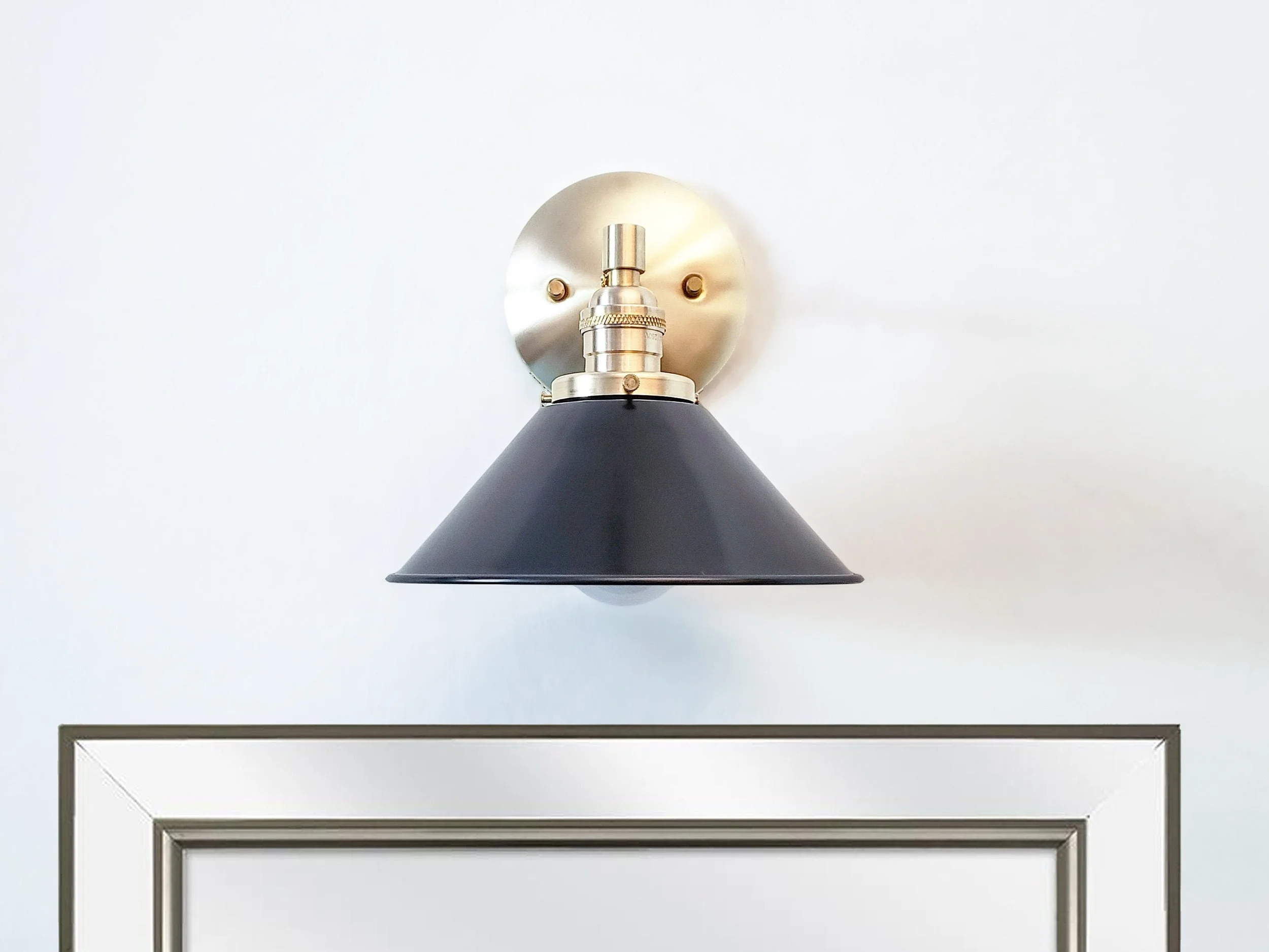 This dynamic design features a matte black metal cone shade, perfect for a distinguished industrial look. In a beautiful brushed brass finish, this sconce is perfectly at home above a bathroom mirror or as extra lighting in kitchens, where your hardware truly shines. Also available in other single and multi-light configurations, the geometric shape adds elegant interest to any space.